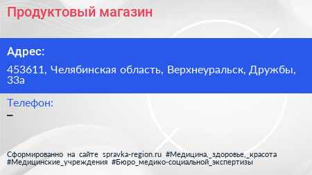 Продуктовый магазин по адресу 453611, Челябинская область, Верхнеуральск, Дружбы, 33а в дальнейшем Организация, размещена в следующих категориях:
