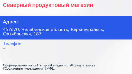 Северный, продуктовый магазин по адресу 457670, Челябинская область, Верхнеуральск, Октябрьская, 187 в дальнейшем Организация, размещена в следующих категориях: