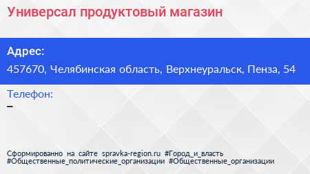 Универсал, продуктовый магазин по адресу 457670, Челябинская область, Верхнеуральск, Пенза, 54 в дальнейшем Организация, размещена в следующих категориях: