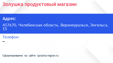 Золушка, продуктовый магазин по адресу 457670, Челябинская область, Верхнеуральск, Энгельса, 15 в дальнейшем Организация, размещена в следующих категориях: