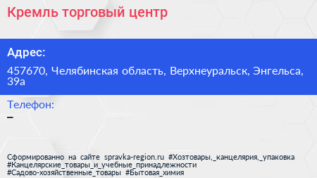 Кремль, торговый центр по адресу 457670, Челябинская область, Верхнеуральск, Энгельса, 39а в дальнейшем Организация, размещена в следующих категориях: