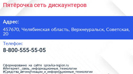 Пятёрочка, сеть дискаунтеров по адресу 457670, Челябинская область, Верхнеуральск, Советская, 20 в дальнейшем Организация, размещена в следующих категориях:
