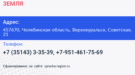 ЗЕМЛЯ+ по адресу 457670, Челябинская область, Верхнеуральск, Советская, 21 в дальнейшем Организация, размещена в следующих категориях: