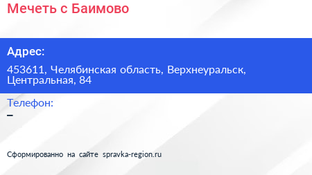 Мечеть, с. Баимово по адресу 453611, Челябинская область, Верхнеуральск, Центральная, 84 в дальнейшем Организация, размещена в следующих категориях: