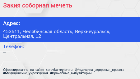 Закия, соборная мечеть по адресу 453611, Челябинская область, Верхнеуральск, Центральная, 12 в дальнейшем Организация, размещена в следующих категориях: