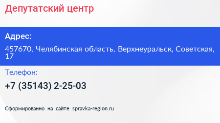 Депутатский центр по адресу 457670, Челябинская область, Верхнеуральск, Советская, 17 в дальнейшем Организация, размещена в следующих категориях: