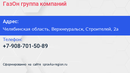 ГазОн, группа компаний по адресу Челябинская область, Верхнеуральск, Строителей, 2а в дальнейшем Организация, размещена в следующих категориях: