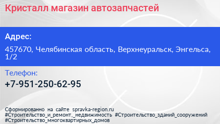 Кристалл, магазин автозапчастей по адресу 457670, Челябинская область, Верхнеуральск, Энгельса, 1/2 в дальнейшем Организация, размещена в следующих категориях: