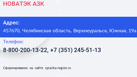 НОВАТЭК-АЗК по адресу 457670, Челябинская область, Верхнеуральск, Южная, 19а в дальнейшем Организация, размещена в следующих категориях: