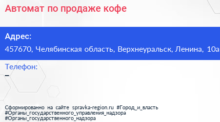 Автомат по продаже кофе по адресу 457670, Челябинская область, Верхнеуральск, Ленина, 10а в дальнейшем Организация, размещена в следующих категориях: