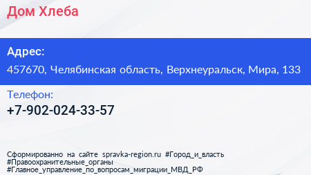 Дом Хлеба по адресу 457670, Челябинская область, Верхнеуральск, Мира, 133 в дальнейшем Организация, размещена в следующих категориях: