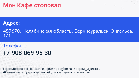Мон Кафе, столовая по адресу 457670, Челябинская область, Верхнеуральск, Энгельса, 1/1 в дальнейшем Организация, размещена в следующих категориях: