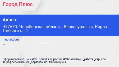 Город Плюс по адресу 457670, Челябинская область, Верхнеуральск, Карла Либкнехта, 2 в дальнейшем Организация, размещена в следующих категориях: