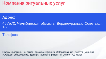 Компания ритуальных услуг по адресу 457670, Челябинская область, Верхнеуральск, Советская, 18 в дальнейшем Организация, размещена в следующих категориях: