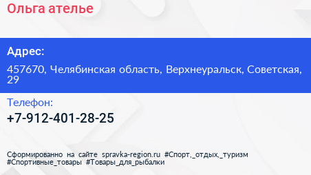Ольга, ателье по адресу 457670, Челябинская область, Верхнеуральск, Советская, 29 в дальнейшем Организация, размещена в следующих категориях: