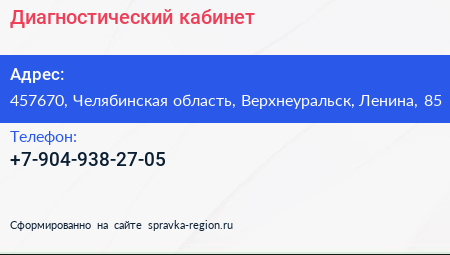 Диагностический кабинет по адресу 457670, Челябинская область, Верхнеуральск, Ленина, 85 в дальнейшем Организация, размещена в следующих категориях: