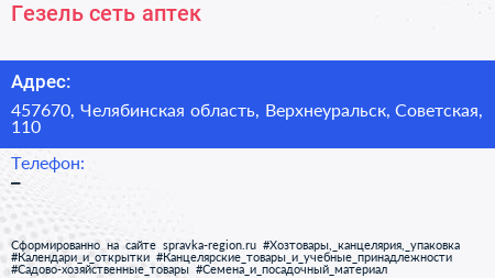 Гезель, сеть аптек по адресу 457670, Челябинская область, Верхнеуральск, Советская, 110 в дальнейшем Организация, размещена в следующих категориях: