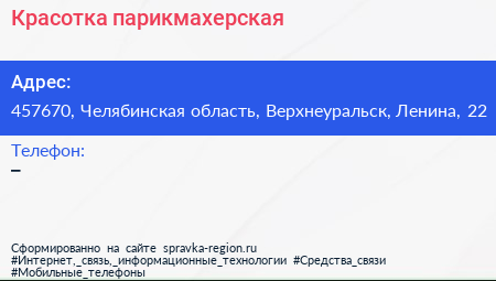 Красотка, парикмахерская по адресу 457670, Челябинская область, Верхнеуральск, Ленина, 22 в дальнейшем Организация, размещена в следующих категориях: