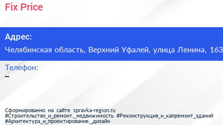 Fix Price по адресу Челябинская область, Верхний Уфалей, улица Ленина, 163 в дальнейшем Организация, размещена в следующих категориях:
