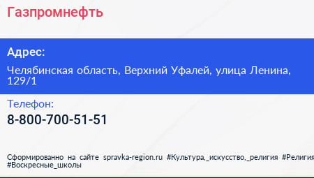 Газпромнефть по адресу Челябинская область, Верхний Уфалей, улица Ленина, 129/1 в дальнейшем Организация, размещена в следующих категориях: