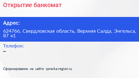 Открытие, банкомат по адресу 624766, Свердловская область, Верхняя Салда, Энгельса, 87 к1 в дальнейшем Организация, размещена в следующих категориях: