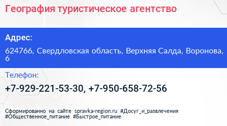 География, туристическое агентство по адресу 624766, Свердловская область, Верхняя Салда, Воронова, 6 в дальнейшем Организация, размещена в следующих категориях: