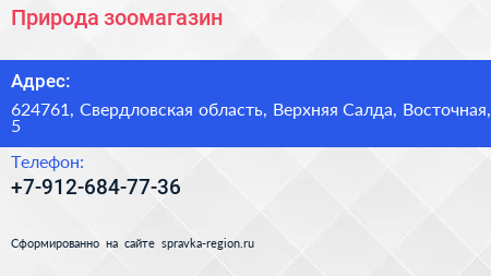 Природа, зоомагазин по адресу 624761, Свердловская область, Верхняя Салда, Восточная, 5 в дальнейшем Организация, размещена в следующих категориях: