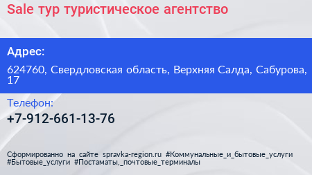 Sale тур, туристическое агентство по адресу 624760, Свердловская область, Верхняя Салда, Сабурова, 17 в дальнейшем Организация, размещена в следующих категориях: