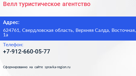 Велл, туристическое агентство по адресу 624761, Свердловская область, Верхняя Салда, Восточная, 1а в дальнейшем Организация, размещена в следующих категориях: