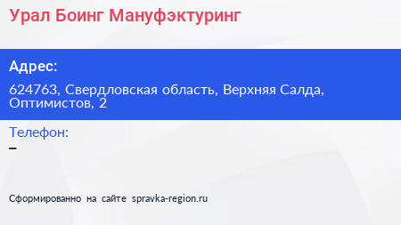 Урал Боинг Мануфэктуринг по адресу 624763, Свердловская область, Верхняя Салда, Оптимистов, 2 в дальнейшем Организация, размещена в следующих категориях: