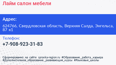 Лайм, салон мебели по адресу 624766, Свердловская область, Верхняя Салда, Энгельса, 87 к1 в дальнейшем Организация, размещена в следующих категориях: