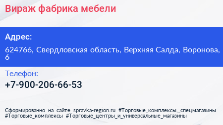 Вираж, фабрика мебели по адресу 624766, Свердловская область, Верхняя Салда, Воронова, 6 в дальнейшем Организация, размещена в следующих категориях: