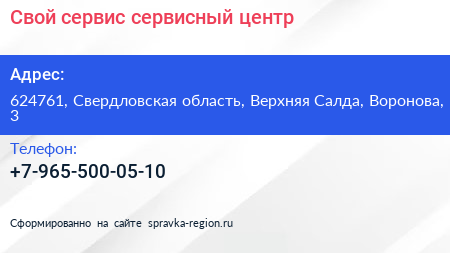 Свой сервис, сервисный центр по адресу 624761, Свердловская область, Верхняя Салда, Воронова, 3 в дальнейшем Организация, размещена в следующих категориях: