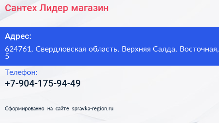 Сантех Лидер, магазин по адресу 624761, Свердловская область, Верхняя Салда, Восточная, 5 в дальнейшем Организация, размещена в следующих категориях: