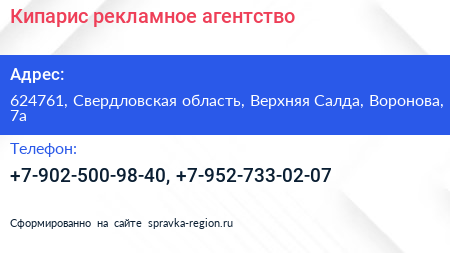 Кипарис, рекламное агентство по адресу 624761, Свердловская область, Верхняя Салда, Воронова, 7а в дальнейшем Организация, размещена в следующих категориях: