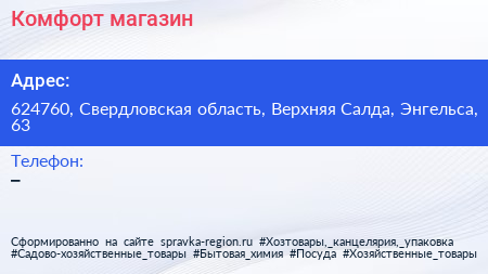 Комфорт, магазин по адресу 624760, Свердловская область, Верхняя Салда, Энгельса, 63 в дальнейшем Организация, размещена в следующих категориях: