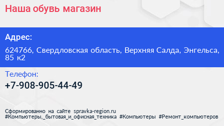 Наша обувь, магазин по адресу 624766, Свердловская область, Верхняя Салда, Энгельса, 85 к2 в дальнейшем Организация, размещена в следующих категориях: