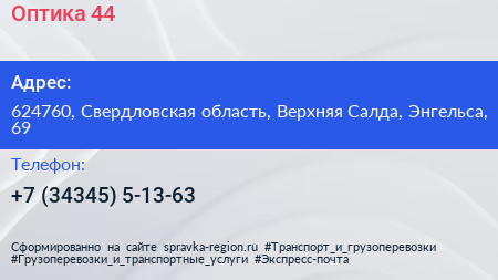 Оптика №44 по адресу 624760, Свердловская область, Верхняя Салда, Энгельса, 69 в дальнейшем Организация, размещена в следующих категориях: