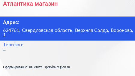 Атлантика, магазин по адресу 624761, Свердловская область, Верхняя Салда, Воронова, 1 в дальнейшем Организация, размещена в следующих категориях: