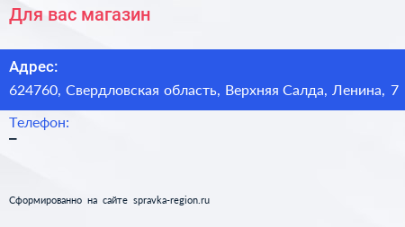 Для вас, магазин по адресу 624760, Свердловская область, Верхняя Салда, Ленина, 7 в дальнейшем Организация, размещена в следующих категориях: