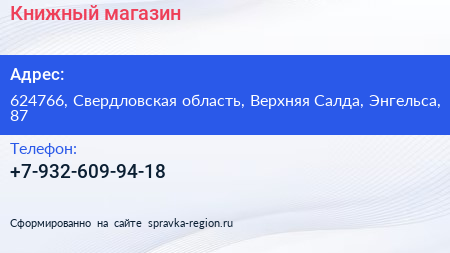 Книжный магазин по адресу 624766, Свердловская область, Верхняя Салда, Энгельса, 87 в дальнейшем Организация, размещена в следующих категориях: