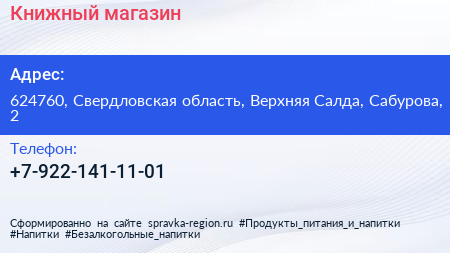 Книжный магазин по адресу 624760, Свердловская область, Верхняя Салда, Сабурова, 2 в дальнейшем Организация, размещена в следующих категориях:
