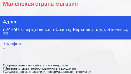 Маленькая страна, магазин по адресу 624760, Свердловская область, Верхняя Салда, Энгельса, 77 в дальнейшем Организация, размещена в следующих категориях: