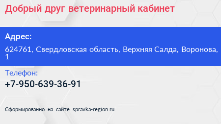 Добрый друг, ветеринарный кабинет по адресу 624761, Свердловская область, Верхняя Салда, Воронова, 1 в дальнейшем Организация, размещена в следующих категориях:
