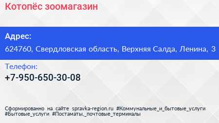 Котопёс, зоомагазин по адресу 624760, Свердловская область, Верхняя Салда, Ленина, 3 в дальнейшем Организация, размещена в следующих категориях: