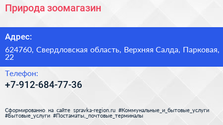 Природа, зоомагазин по адресу 624760, Свердловская область, Верхняя Салда, Парковая, 22 в дальнейшем Организация, размещена в следующих категориях: