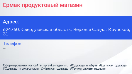 Ермак, продуктовый магазин по адресу 624760, Свердловская область, Верхняя Салда, Крупской, 31 в дальнейшем Организация, размещена в следующих категориях: