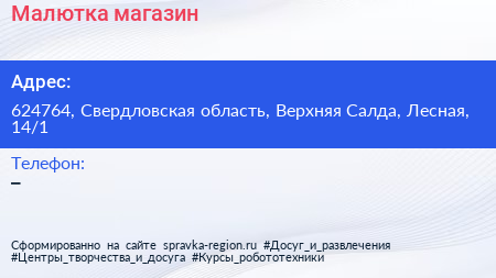 Малютка, магазин по адресу 624764, Свердловская область, Верхняя Салда, Лесная, 14/1 в дальнейшем Организация, размещена в следующих категориях: