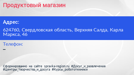 Продуктовый магазин по адресу 624760, Свердловская область, Верхняя Салда, Карла Маркса, 46 в дальнейшем Организация, размещена в следующих категориях: