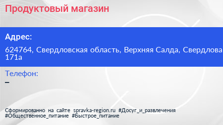 Продуктовый магазин по адресу 624764, Свердловская область, Верхняя Салда, Свердлова, 171а в дальнейшем Организация, размещена в следующих категориях: